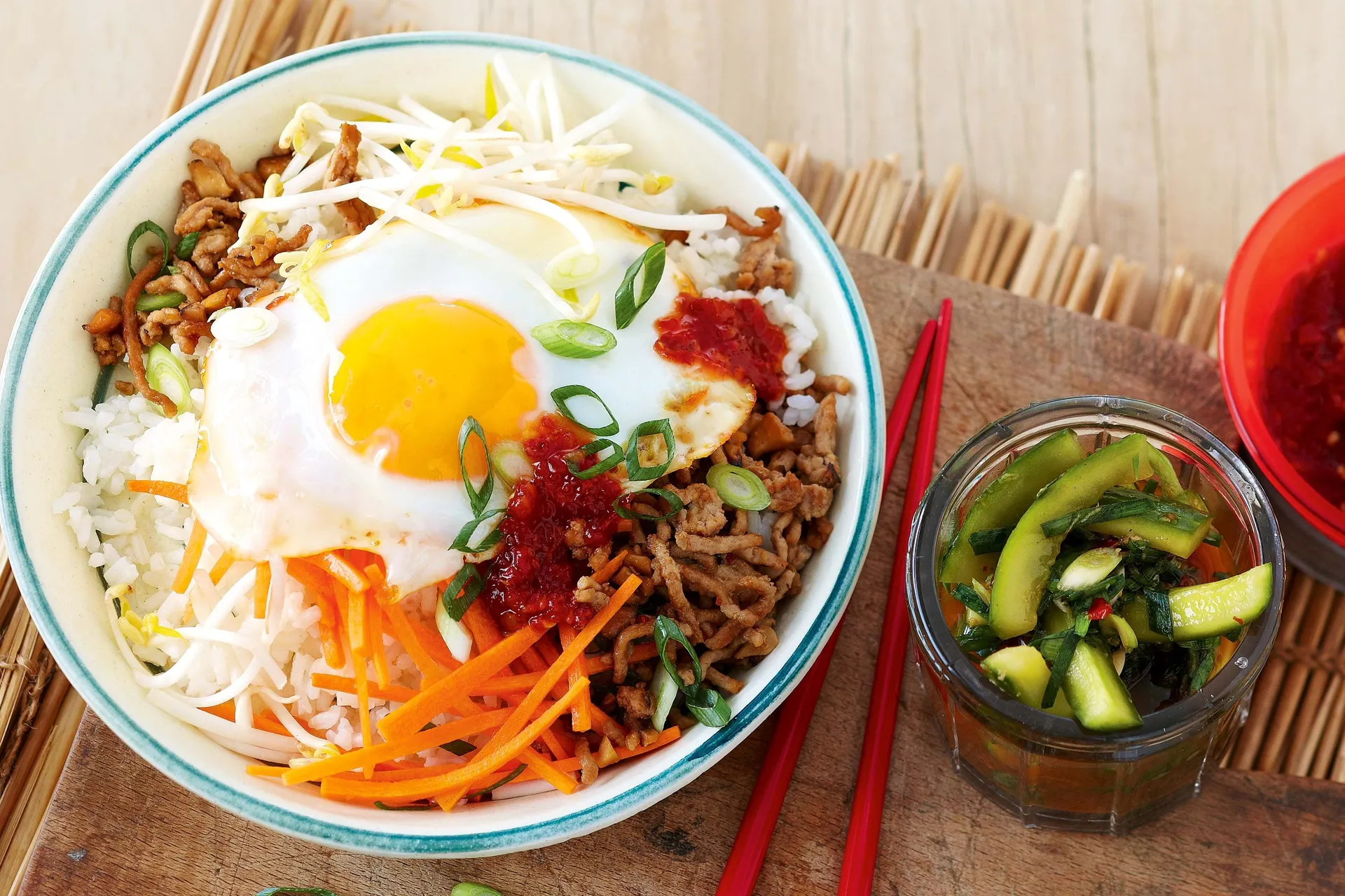 Bibimbapem Uma Superfície De Bambu. Papéis de Parede -