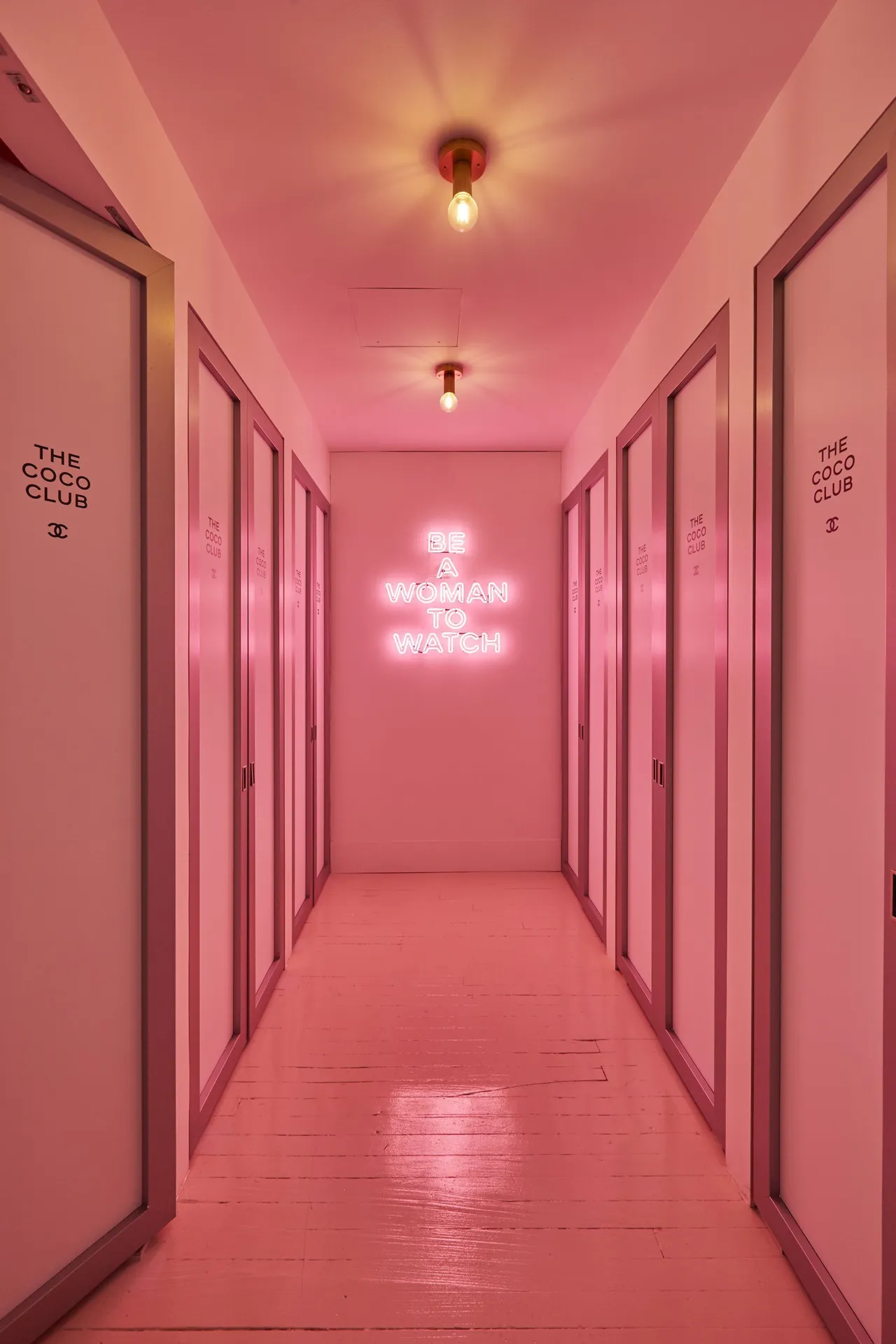 Umcorredor Com Portas Cor De Rosa E Uma Placa De Néon. Papéis de Parede -