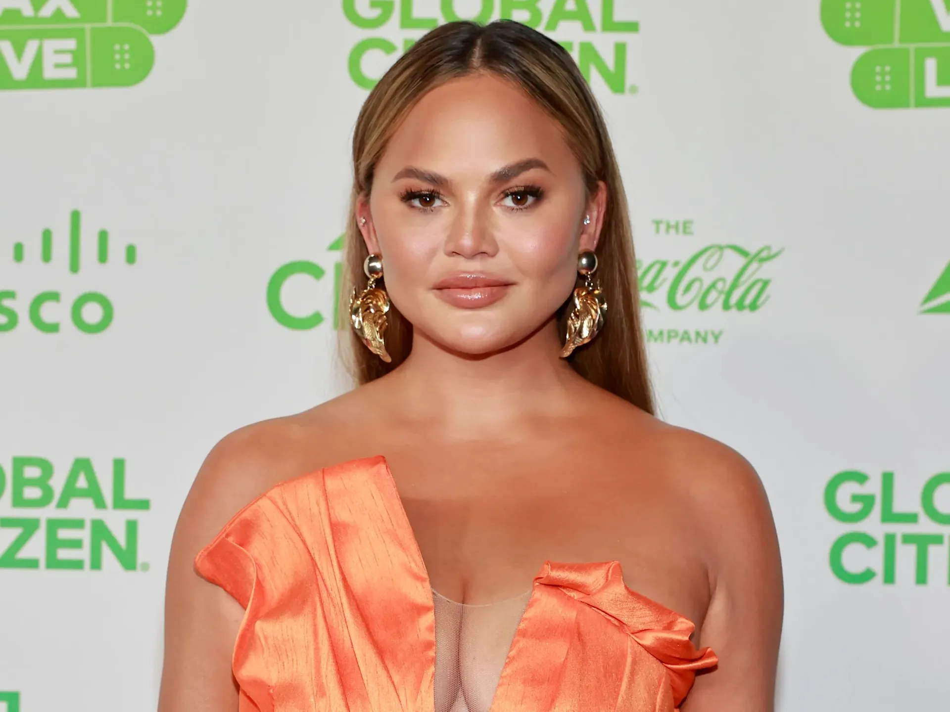 Chrissy Teigen Em Vestido Laranja No Evento Global Citizen Papéis de Parede -