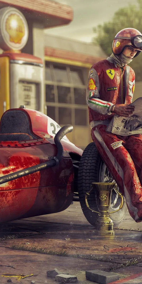 Umhomem Está Sentado Ao Lado De Um Carro De Corrida Vermelho. -